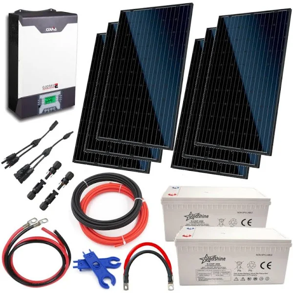Complete Hybrid Off-grid Solar Power Kit, a full system which provides 4.8KWh per day, includes 6 x 300W solar panels (1800W Solar PV), 3Kw 3.6kVa Hybrid Solar Inverter with 80A MPPT Charge Controller, batteries, cables, battery links & installation accessories